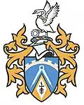 | Buckingham, granted November 1986 Escutcheon: Azure a Pall reversed between in chief two Bucks Heads caboshed Gold and in base three Bars Wavy Argent Note: The university uses the swan (a symbol of Buckinghamshire) of its crest as a logo. | |