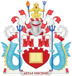 | Birmingham, granted 27 August 1900 Escutcheon: Per chevron the chief per pale Gules and Azure in dexter a lion rampant with two heads in sinister a mermaid holding in the dexter hand a mirror and in the sinister a comb Or the base Sable charged with an open book Proper with two buckles and straps and edges of the third inscribed "PER ARDUA AD ALTA". The open book represents learning. The double headed lion and mermaid are adopted from the arms of Josiah Mason founder of the Mason Science College an institution which was incorporated into the university in 1900. | |