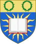 | Open, granted 1971, replaced 15 June 2011[58] Escutcheon: Azure, an open book Proper bound Gules and irradiated Or and on a Chief also Or two wreaths of laurel fructed Proper. In the original arms a television screen and a pair of tape reels represented the technology initially used to support teaching. The new grant in 2011 removed the television screen, but retained the book and replaced the tape reels with laurel wreaths. The escutcheon featured in the crest is used as a logo by the university. | |