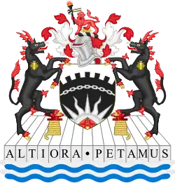 | Salford, granted 6 January 2017[59] Escutcheon: Sable above a demi Sun issuant in base Argent charged with a demi Rose likewise issuant Gules barbed and seeded proper a Chain fesswise throughout enhanced and enarched and a Chief embattled and enarched Argent. On the shield the red rose represents Lancashire, the sun enlightenment and the chain and cogwheel the area's industrial heritage. Likewise the bollards, rope and quayside. The blue wavy line is the River Irwell. The (worker) bees found on the supporters represent Manchester. On the crest the lion represents bravery, strength and valour, the shuttle underneath the hind paw represents industry. The firebasket represents truth and knowledge. | |