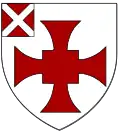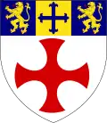 | Durham, granted 22 May 1843[25] Escutcheon: Argent a Cross Pattée quadrate Gules; a Canton Azure charged with a Chevron Or between three Lions rampant of the First. The arms feature St Cuthbert's cross, referencing the link to Durham Cathedral (the shrine of St Cuthbert) and, in the canton, the arms of Bishop Hatfield of Durham, the founder of Durham College, Oxford, advancing the idea that the university is its successor institute.[26][27] St Cuthbert's Cross was used as the university's seal prior to the grant of arms and appears on the coats of arms of many Durham colleges, as well as those of Newcastle University. | |