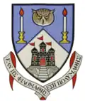 | Aberdeen, granted 26 September 1888 Escutcheon: Quarterly: 1st Azure a bough pot Or charged with three salmon fishes in fret Proper and containing as many lilies of the garden the dexter in bud the centre full blown and the sinister half blown also Proper flowered Argent issuant from the middle chief amid rays of the sun a dexter hand holding an open book likewise Proper, 2nd Argent a chief paly of six Or and Gules, 3rd Argent a chevron sable between three boars' heads erased Gules armed of the field and langued Azure, 4th Gules a tower triple-towered Argent masoned Sable windows and port of the last. The university's coat of arms incorporates those of the founders and locations of the two colleges it is derived from. In the top left quadrant are the arms of the burgh of Old Aberdeen, with the addition of a symbol of knowledge being handed down from above. Top right are those of George Keith, the fifth Earl Marischal. Bottom left are those of Bishop William Elphinstone.[17] The bottom right quarter is a simplified version of the three castles which represent the city of Aberdeen[18] (this symbol of the city also appears prominently on the arms of The Robert Gordon University). In 1995 the university was granted a crest and supporters to celebrate its 500th anniversary. These are a leopard on the dexter a side and a hart on the sinister.[19][20] | |