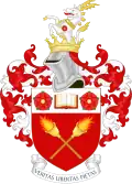 | Aston, granted 18 March 1955 to predecessor the College of Technology, Birmingham. Grant of supporters 29 June 2016.[47] Escutcheon: Azure, five lozenges conjoined in bend Or; on a chief argent, an open book proper, bound gules edged Or, between two hammers erect sable. On the chief the book represents learning and the ball-pein hammers the connection with metalwork industry. The mural crown in the crest is used by public bodies. The laurel wreath represents academia and also a link to Birmingham.[48] The five lozenges reference the arms of the city of Birmingham. | |