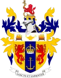 | Teesside, granted 22 June 1993 Escutcheon: Or on a Pale between two Lions combattant Azure an Open Book of the field between in chief a Rose Argent barbed and seeded proper and in base a Lymphad also Or The shield includes a white rose of Yorkshire, a ship representing the town's maritime heritage and a book (learning). The crest includes an anchor, also a maritime reference. | ||