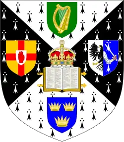 | Queen's, Belfast, granted 24 March 1910 by Nevile Wilkinson, Ulster King of Arms.[40] Escutcheon: Per saltire Azure and Argent on a saltire Gules between in chief an open book and in base a harp both Proper in dexter a hand couped of the third and in sinister a seahorse gorged with a mural crown of the fourth an imperial crown of the last. The crown represents the link to Queen Victoria and the university's early link to the former Queen's University of Ireland. St Patrick's saltire references Ireland and was also found on the arms of the former institution. The book represents learning, the seahorse Belfast, the harp Ireland and the red hand Ulster.