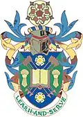 | Sheffield, granted June 1905 Escutcheon: Azure an open book Proper edged Gold inscribed with the words "DISCE DOCE" between in fess two sheaves of eight arrows interlaced saltireways and banded Argent in chief an open crown Or and in base a rose also Argent barbed and seeded Proper. The open book inscribed with Disce Doce (Learn and Teach) is self-explanatory. The sheaves of eight silver arrows are from the arms of the city of Sheffield. The gold crown is a 'crown of success' i.e. an emblem of achievement and the white rose represents Yorkshire.[44] | |