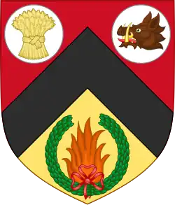 ![]() | Birmingham (University College), granted 20 September 1962 (to the Lord Mayor, Aldermen and Citizens of the City of Birmingham for the use of The Birmingham College of Food and Domestic Arts); transferred by royal licence 22 December 2014[105] Escutcheon: Per chevron Gules and Or a Chevronel Sable between in chief two Roundels Argent the dexter charged with a Garb and the sinister with a Boar's Head couped at the neck proper and in base a Flame of Fire between two Sprigs of Bay the stems crossed in base proper tied with a Riband Gules. | |
