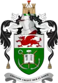 | Aberystwyth, granted 7 May 1938 to predecessor University College Wales[100] Escutcheon: Per chevron Or and vert in chief two dragons combatant gules, armed and langued azure, and in base an open book proper The two red dragons symbolise the optimism of Victorian north and south Wales and the open book symbolises the world of learning. The phoenix in the crest represents rebuilding after a fire in 1885.[101] | |
