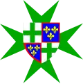 | Marie of Anjou (1404 † 1463), daughter of Louis II, Duke of Anjou and Count of Provence, married in 1422 to Charles VII (1403 † 1461) Dimidiated, azure, three fleurs-de-lys or, and per pale, argent, a cross potent or, cantonned with four crosses or, dimidiated with azure, semé-de-lys or, a label gules and azure, semé-de-lys or, a bordure gules.[12] |