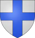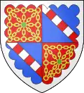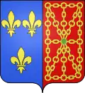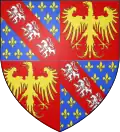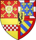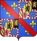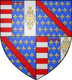 In 1453 : Per fess, the chief tierced in pale, 1 barry of gules and argent, 2 azure, semé-de-lys or, a label gules, 3 argent, a cross potent or, cantonned by four crosslets or; the base per pale, azure, semé-de-lys or, a bordure gules, and azure, semy of crosslets or, two barbels or. Overall or, four pallets gules.[3] In 1470 : Per saltire, 1 azure, semé-de-lys or, a label gules; 2 barry of gules and argent; 3 argent, a cross potent or, cantonned by four crosslets or; 4 azure, semy of crosslets or, two barbels or. Overall azure, three fleurs-de-lys or, a bordure gules.[3] |