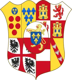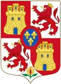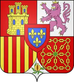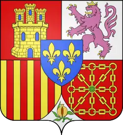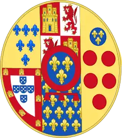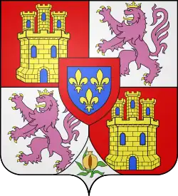 | Élisabeth de France (1545 † 1568), Queen of Spain, daughter of Henry II, married in 1559 to Philip II of Spain (1527 † 1598) Per pale, I, Quarterly, 1 and 4 gules, a three-towered castle or, masoned sable and ajouré azure; 2 and 3, argent, lion rampant purpure crowned or, langued and armed gules, enté en point argent a pomegranate proper seeded gules, supported, sculpted and slipped vert; II, azure, three fleurs-de-lys or. |