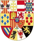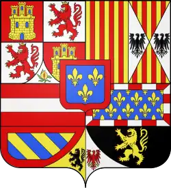| Mary of Burgundy (1457 † 1482), duchess de Burgundy and Brabant, countess of Hainaut and Holland..., only child of the last duke of Burgundy Charles le Téméraire Impaled her husband's arms Maximilian of Austria (left) top impaled Austria Ancient and Austria modern, on bottom tiercé impaled Styria, de Carinthia et de Carniola, overall Tyrol with her father's (on the right) Quarterly, 1 and 4, azure, semé-de-lys or, a bordure compony of argent and gules; 2 per pale, bendy of six or and azure, a bordure gules and sable, a lion or, armed and langued gules; 3 per pale, bendy of six, or and azure, a bordure gules and argent, a lion gules, armed and langued or. Overall, or, a lion sable armed and langued gules.,[15] |