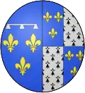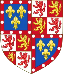 | Charles of France, Duke of Berry, then Duke of Normandy, then Duke of Guyenne (1446 † 1472), son of Charles VII, King of France In 1461 : Azure, three fleurs-de-lys or, a bordure engrailed gules (Berry).[3] In 1465 : Quarterly: 1 and 4, azure, three fleurs-de-lys or, a bordure engrailed gules (Berry); 2 and 3, gules, two lion passants or (Normandy).[3] After 1469 : Quarterly: 1 and 4, azure, three fleurs-de-lys or, a bordure engrailed gules (Berry); 2 and 3, gules, a lion passant or (Guyenne).[9] |