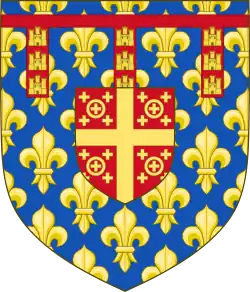 | Robert I (1216 † 1250), Count of Artois, son of Louis VIII the Lion and of Blanche of Castile Azure, semé-de-lys or, a label gules, each point charged with three castles or.[1] These arms were used by the descendants in the male line of Robert. (House of Artois) |