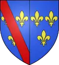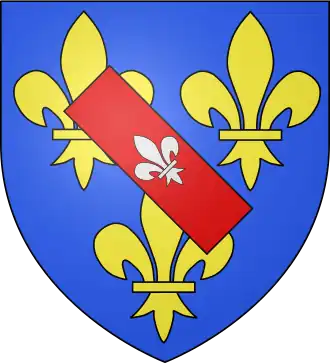 | John d'Orléans (1402 † 1468), Count of Dunois, illegitimate son of Louis d'Orléans Azure, three fleurs-de-lys or, a label argent, overall a bend sinister argent,[13] For his descendants, the Counts of Longueville: Azure, three fleurs-de-lys or, a label argent, overall a baton sinister argent.[13] |