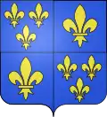 ![]() | Kings of France before 1376 : Azure, semé-de-lys or.[1] The arms of France was first used by Philip Augustus at the beginning of the age of heraldry. Collateral branches of the French royal family already in existence – the Dukes of Burgundy, the Counts of Vermandois and Dreux, and the Lords of Courtenay – used unrelated coats of arms, while the descendants of Philip Augustus bore the arms of France with marks of cadency. after 1376 : Azure, three fleurs-de-lys or.[2] Borne by the following: