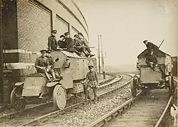 The Lancia armoured cars were built by the Great Southern and Western Railway workshops, Dublin, in 1921 for the Royal Irish Constabulary. 111 Lancias were received by the Irish National Army and all were disposed of by 1937. As many as fifty Lancias were fitted with railway wheels and used by the Railway Protection, Repair and Maintenance Corps for railway patrols.[7]