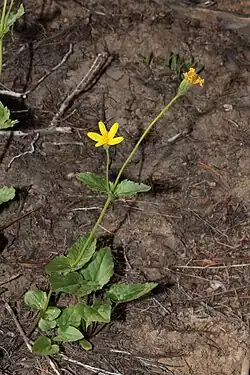 The inflorescence contains one or more daisy-like flower heads lined in glandular phyllaries. Each has a center of yellow disc florets and several yellow ray florets up to 3 centimeters long. The fruit is an achene with a white pappus.[5]