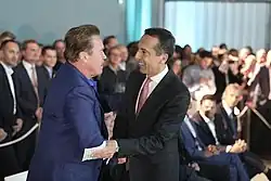 As a registered member of the Republican Party, Schwarzenegger chaired the President's Council on Physical Fitness and Sports during most of the George H. W. Bush administration. In 2003, he was elected governor of California in a special recall election to replace Gray Davis, the governor at the time. He received 48.6 percent of the vote, 17 points ahead of the runner-up, Cruz Bustamante of the Democratic Party. He was sworn in on November 17 to serve the remainder of Davis' term, and was reelected in the 2006 gubernatorial election with an increased vote share of 55.9 percent to serve a full term.[16] In 2011, he reached his term limit as governor and returned to acting. As of 2025, Schwarzenegger and Steve Poizner are the last Republicans to win or hold statewide office in California, having both won their respective elections in 2006.