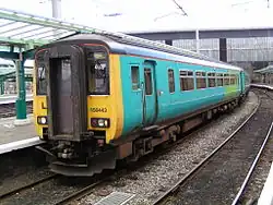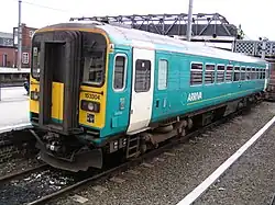 On 18 February 2000, MTL was purchased by Arriva,[9][10][11] and on 27 April 2001 the franchise was rebranded as Arriva Trains Northern.[12][13] The Arriva corporate turquoise and stone livery was introduced on refurbished 153352 in July 2001.[14][15]