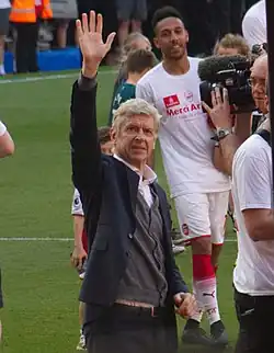 Arsenal financed moves for Granit Xhaka and Shkodran Mustafi in mid-2016 for a combined £65 million, rendering the pair one of Arsenal's most expensive ever signings, as Wenger hoped to guide the club to their first league title win in over thirteen years the following season.[254][255] Although Arsenal began strongly in the league, losing only once until December, back-to-back defeats to Everton and Manchester City resulted in Arsenal losing their stronghold on the league. Wenger also served a four-match touchline ban and had to pay a £25,000 fine after pushing referee Anthony Taylor during a win at home against Burnley.[256] Further defeats to Chelsea and Liverpool all but rendered Arsenal out of the title race, and left qualification to the Champions League threatened by March. On 30 April, Arsenal lost to main rivals Tottenham which had confirmed the latter had finished above them in the Premier League for the first time since the 1994–95 FA Premier League season.[257] The following month also saw them fail to finish in the top four since the 1996–97 FA Premier League season.[258] On 27 May, Wenger became the most successful manager in the history of the FA Cup as Arsenal beat Premier League winners Chelsea 2–1 at Wembley through goals from Alexis Sánchez and Aaron Ramsey. The victory represented a further record for Wenger, as Arsenal too, became the most successful club in the competition's history as they won the competition for the 13th time.[259] Four days following the win, Wenger signed a contract extension until 2019.[260]