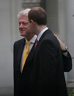 Yatsenyuk's first government post was as Minister of Economy from 2005 to 2006; subsequently he was Foreign Minister of Ukraine in 2007 and Chairman of the Verkhovna Rada (parliament) from 2007 to 2008. Yatsenyuk was one of the leaders of Ukraine's second largest party All-Ukrainian Union "Fatherland",[3] and former leader of its parliamentary faction.[4][5][6][7] He became the prime minister of Ukraine following the 2014 revolution that removed Viktor Yanukovych from power.[8][9] In September 2014, Yatsenyuk started the new party People's Front.[10] On 16 February 2016, the President of Ukraine, Petro Poroshenko, asked Yatsenyuk to resign saying he had lost the support of the coalition[11] and the same day, the Ukrainian parliament voted the cabinet's work unsatisfactory but rejected a call for a vote of no confidence.[12] On 10 April 2016, Yatsenyuk announced that he would report to parliament on 12 April and resign as prime minister.[13] On 14 April 2016, Yatsenyuk was replaced by new prime minister Volodymyr Groysman.[14] Chairman of the Kyiv Security Forum[15] and the founder of Open Ukraine Foundation.[16] He holds the diplomatic rank of extraordinary and plenipotentiary ambassador.[1]
