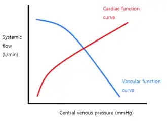 The cardiac function curve expresses how systemic flow changes as a function of the central venous pressure; it represents the Frank-Starling mechanism. The vascular function curve expresses how "central venous pressure" changes as a function of "systemic flow". Note that, for cardiac function curve, "central venous pressure" is the independent variable and "systemic flow" is the dependent variable; for vascular function curve, the opposite is true.