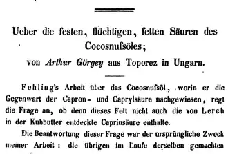 - ^ Görgei Artúr, Über die festen, flüchtigen, fetten Säueren des Cocusnussöles Sitzungsberichte der kais. Akademie der Wissenschaften, Erster Band, Jahrgang 1848, Heft I-V. Zweite Unveranderte Auflage. Wien, pp. 208–226 (in German)