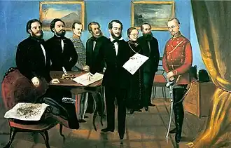Among the generals whom the Hungarian officers would accept as the supreme commander, Görgei was the most popular; and in an officers meeting held in Tiszafüred, in the presence of the government's chief commissary Bertalan Szemere, they elected Görgei as the commander-in-chief, with their decision ratified by Szemere. When Kossuth heard about this, he was angered and rushed to the military camp, thinking that Görgei was its organizer and declaring that he would order Görgei executed for this revolt. But when he arrived at Tiszafüred and saw that the majority of the officers supported Görgei, Kossuth was forced to accept the situation. However, he declared that the final decision about who would be the commander would be announced after he presented the facts to the Parliament.[28] In Debrecen, Kossuth and his political supporters ignored the wishes of the Hungarian generals to name Görgei and designated Antal Vetter as commander-in-chief.[29] On 8 March, by way of consolation, Görgei was decorated with the Second Class Military Order of Merit.[30]