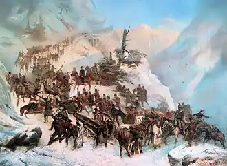 Another of Görgei's goals was to relieve the border fortress of Lipótvár from an enemy siege and to take the defenders and the provisions from this fort to Debrecen; but he saw that this would be too risky, due to the danger of encirclement by the enemy. So, he renounced this plan, and Lipótvár was forced to surrender to the Austrians on 2 February 1849.[21] Despite this, he succeeded in accomplishing other goals mentioned earlier. In the harsh winter, marching in the mountains, several times Görgei and his troops escaped encirclement by the Austrian troops (at one point escaping by opening a formerly closed mine tunnel and passing through it to the other side of a mountain).[22] Then, on 5 February 1849, they broke through the mountain pass of Branyiszkó, defeated General Deym in the Battle of Branyiszkó, and united with the Hungarian troops led by György Klapka on the Hungarian plains.[23]