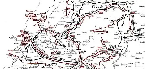 During the spring campaign, Görgei's tactical outlook changed drastically, from being an extremely cautious commander who planned for slow, calculated movements, to a general full of energy, quick in action and ready to take risks if necessary to achieve his goals. Görgei understood that the main cause of Dembiński's failure was the latter's extreme cautiousness, which prevented him from concentrating his troops before the Battle of Kápolna. Fearful of being encircled, Dembiński had deployed his units so far from each other that they could not support each other when attacked.[31] Görgei started the spring campaign as a mature commander, who let his corps commanders (János Damjanich, Lajos Aulich, György Klapka, András Gáspár) make independent decisions while following a general battle plan, intervening only when needed, as he did at Tápióbicske and Isaszeg, where he turned, by his presence and decisiveness, the tide of battle in his favor.[34] He took great risks at the start of both phases of his spring campaign because he left only a few troops in front of the enemy, while sending the bulk of his army to make encircling maneuvers, which, if discovered, could have led to a frontal attack of the enemy, the breaking of the weak Hungarian front line, cutting of his supply lines, and the occupation of Debrecen, the temporary Hungarian capital.[43] Görgei later wrote in his memoirs that he knew that he could take these risks against such a weak commander as Windisch-Grätz.[34]