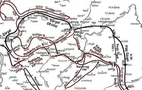 The plan of the spring campaign had to take into account the fact that the enemy troops were numerically superior to the Hungarians. So, it was decided to defeat them in detail.[31] The plan was that the VIIth Hungarian Corps would feint to divert the attention of the Austrian commanders, while the other three Hungarian army corps (the Ist, the IInd, and the IIIrd) would advance from the south, getting around the enemy, and fall on their rear, forcing them to retreat over the Danube, leaving the Hungarian capitals (Pest and Buda) in the hands of the Hungarian army. The minimal objective of the Hungarians was to force the Austrians to retreat from the Danube–Tisza Interfluve. During these operations, due to the faults of some of Görgei's corps commanders (György Klapka and András Gáspár), as well to Windisch-Grätz cautiousness, the latter managed to escape the trap of being surrounded; but nevertheless, because of his defeats at Hatvan (2 April), Tápióbicske (4 April), and Isaszeg (6 April), Windisch-Grätz was forced to retreat from the interfluve, taking refuge in the Hungarian capitals.[33] In two of these battles (Tápióbicske and Isaszeg), the intervention of Görgei on the battlefield, who spoke personally to the hesitant Klapka, ordering him to hold his position and to counterattack, decided the battle for the Hungarians.[34]