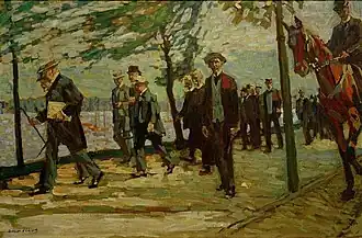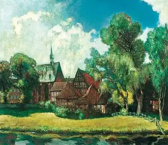 In 1908, he became a lecturer at the Staatliche Kunstgewerbeschule (now the University of Fine Arts), for a newly established nude drawing course.[2] During World War I he was exempted from compulsory military service, but went to the front for three months in 1916, on behalf of Otto Lauffer, Director of the Museum for Hamburg History, to make sketches that were exhibited in 1918. After the war, he focused on religious painting. During the following years, Anti-Semitic sentiments began to appear in his personal letters. He became a member of the Militant League for German Culture in 1928, and joined the Nazi Party in 1933.[3] As a result, he was dismissed from his teaching position and moved his family to Lüneburg.