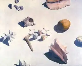 Like the landscapes that would follow, these new paintings were simultaneously more precise and concrete—sometimes suggesting the detachment of Philip Pearlstein[3]—and yet more abstract.[1] Critics attributed this to Lerner's "opalescent light,"[33] which gave his shadows palpable form[21] and created the "effect of a hazy, delicately colored, and possibly mystical procession of shapes across the canvas" that suggested landscapes.[3] This artistic fiction transformed what appeared to be simple paintings, such as Bones, Gourds and Shells (1990), into metaphysical works[20] that evoked a mood of mystery and quietude critics likened to the work of Giorgio Morandi.[21]