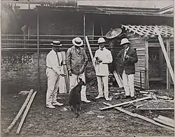 The former British and French concession Shamian Island (then known as Shameen) however is completely intact, and hosts a number of designs by the firm, as well as alterations such as extra floors.[4] They include the Imperial Maritime Customs Building (eastern end of Central Shamian Street on the north side, with a pair of 'witches hat' towers, 1907), Griffith & Co (south west corner of North Shamian and Third Streets, c1905), Karberg & Co, (50 South Shamian Street, 1908),[5] International Banking Co (end of Central Shamian on the north side, 1908), Deacon & Co (northwest corner of Central Shamian and Fifth, 1908).[3] All of the designs were generally in the Far East British Colonial form known as 'compradoric', featuring multi-level verandahs supported on solid pillars or arches, with Italianate or Edwardian Baroque detailing.