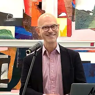 Arturo Herrera is a Venezuelan-born (1959), Berlin-based visual artist known for wide-ranging work that is rooted in the practice of collage.[1][2][3] His colorful, often rhythmic art intertwines bits of pop iconography, gestural marks, and nonrepresentational shapes using pictorial strategies of fragmentation, repetition, effacement, and dislocation.[4][5][6] The resulting imagery often balances between abstraction and figuration (often barely legible), detached from inherent narratives yet vaguely familiar.[7][8] Critics suggest that this ambiguity engages memory, fantasy and a viewer's unconscious private interpretive schemes, evoking a multiplicity of references and readings.[9][10][11] In 2020, Art in America writer Ara H. Merjian described Herrera's practice—which includes works on paper, paintings, reliefs, sculpture, public art and books—as "chameleonic as [it] is consistent," one that "breathes life into modernist collage, exploring the tensions between exactitude and spontaneity, placement and displacement."[1]