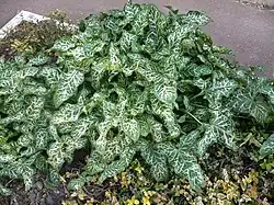 Plants from the British Isles and the Atlantic coast of western Europe with deep green leaves and winter leaves differing in shape from spring leaves have been treated as a distinct subspecies, Arum italicum subsp. neglectum (F. Towns.) Prime.[2] Differences in germination (epigeal in subsp. italicum, hypogeal in subsp. neglectum) and phenology (subsp. italicum beginning growth earlier) have also been reported.[2] However, there are intermediate forms between the two subspecies, particularly on the European mainland, and there have been proposals to merge the two under subsp. italicum.[1][3]