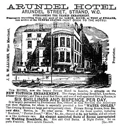 The Arundel Hotel stood at the south end of the street on the western side at the end of the nineteenth century and start of the twentieth. It billed itself as "the largest private hotel in London", providing rooms to professional men, officers, and Americans and their families, "for whom is especially provided a free "water cooler".[5] It was rebuilt in the late nineteenth century and the bay front that faced Victoria Embankment was replaced with a gothic design. The hotel existed until at least the mid-twentieth century.