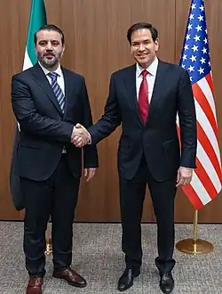 On 29 March 2025, a transitional government was formed, in which al-Shaibani maintained his position.[22] On 10 April 2025, South Korean Foreign Minister Cho Tae-yul visited Damascus and met with al-Shaibani. During the meeting, both sides signed a formal agreement to establish diplomatic relations, which included plans to open embassies and exchange diplomatic missions.[23][24] The agreement made Syria the last United Nations member state, outside of North Korea, to establish diplomatic relations with South Korea.[25] On 15 May 2025, al-Shaibani held a meeting with U.S. Secretary of State Marco Rubio in Antalya, Turkey.[26] The meeting took place two days after U.S. President Donald Trump announced his decision to lift sanctions on Syria and initiate the normalization of bilateral relations.[27]