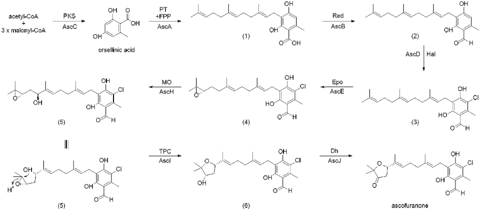 The proposed biosynthesis of ascofuranone was reported by Kita et al., as well as by Abe et al.[6][7] The prenylation of orsellinic acid, followed by terminal cyclization through epoxidation is how ascofuranone can be synthesized. Compound (1), ilicicolinic acid B, was found to be produced from polyketide synthase (PKS) StBA and that AscCABD are responsible for the biosynthesis of ilicicolin A (3). Ilicicolin B (2) was found to be produced by expressing AscC (polyketide synthase) which is then followed by expression of AscA (prenyltransferase). AscD (flavin-dependent halogenase, flavin binding enzyme) is able to catalyze the chlorination of ilicicolinic acid B (2) to yield ilicicolin A (3).