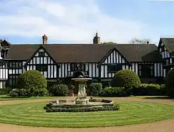 ![]() The centre of the entrance front, the oldest part of the house. A beam over the present front door (behind the fountain) gives the date 1606 | |