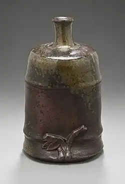 "Natural" ash glaze from ash falling in the kiln tends to collect thickly on the shoulders of typical shapes of storage jar, and begin to drip down the walls of the vessel. This effect might be aided by tying plaits of straw around the shoulders before placing in the kiln.[8]