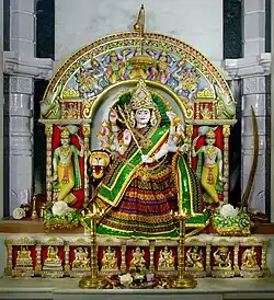 Her temples are also found in other Jadeja domains of Rajkot, Jasdan,[8] Morbi, Gondal, Jamnagar,[9] Ghumli,[9] where the Jadejas, who migrated from Kutch, built her temples and installed her as clan deity.[6][10][11]