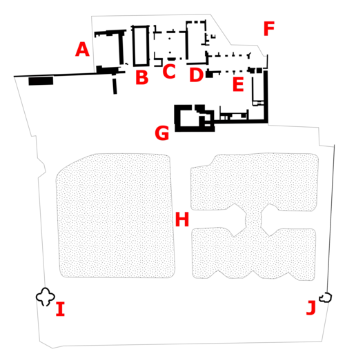 The large chapel, 60 by 21 feet (18.3 by 6.4 m) and built of grey sandstone, lies alongside the Great Chamber, and would originally had an altar on a dais at the north end.[60] One corner of the chapel remains in use as a burial site by the modern Hastings family.[59] An inner, or chapel, court would have been formed by a range of buildings, since lost, stretching between the chapel and the Great Tower.[61] The historian Anthony Emery notes that the castle would have formed a "palace fortress", with the sizeable chapel and adjacent towers constituting symbols of Hastings' power and authority.[62]