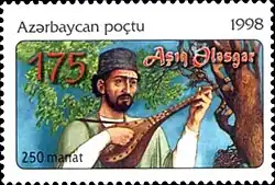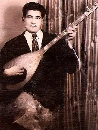 An ashik (Persian: آشیک; Azerbaijani: aşıq; Turkish: âşık) or ashugh (Armenian: աշուղ; Georgian: აშუღი)[1]: 1365 [2][3] is traditionally a singer-poet and bard who accompanies his song, be it a dastan (traditional epic story, also known as hikaye) or a shorter original composition with a long-necked lute, or an other instrument[4]: 225  in Armenian, Iranian, Azerbaijani, Turkish, South Azerbaijani[4] and Georgian cultures of the south caucasus and surrounding regions.[5]: 15–36 [6]: 47 [7][3] In general, the modern ashik is a professional musician who usually serves an apprenticeship, masters playing the duduk, saz, kamancheh, tar, or another instrument (like the sring or daf) and builds up a varied but individual repertoire of folk songs.[8][9]