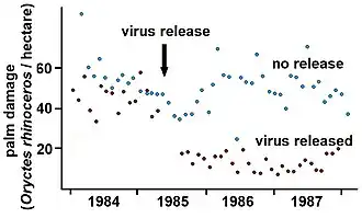 Introduction of the virus into virus-free populations caused a significant decline of the O. rhinoceros population. For example, virus releases in the islands of the Maldives typically reduced the beetle populations to less than one quarter of the level before the release.[29] The virus effects mainly the population of adult O. rhinoceros beetles. It spreads easily among adults, reducing their life span and the fecundity of females.[30][31][14][15]