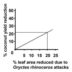 The correlation between Oryctes rhinoceros damage and coconut yield has been estimated in Samoa with two different approaches. Firstly, damage by O. rhinoceros was simulated by cutting off parts of the new fronds as soon as they unfolded.[22] Secondly, the leaf area naturally reduced through O. rhinoceros attacks was estimated in groups of palms damaged to different degrees. The leaf area reduced was then correlated with the number of nuts produced by these palms (see illustration on the right). For example, a reduction of the leaf area by 20% resulted in slightly more than a 20% reduction of coconuts produced. However, the natural variation in coconut yield among the studied palms was high and the reduction in coconut yield was higher in artificially pruned palms, slightly more than 30% for a 20% leaf area reduction.[23]