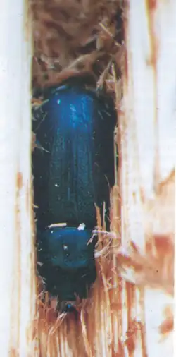 Many species of predators and parasitoids were identified over the years and a variety of species were introduced into the invaded Pacific islands.[27] However, there is little evidence that native or introduced predators and parasitoids cause a significant impact on the populations of the coconut rhinoceros beetle. For example, during a field survey of 600 breeding sites in the Philippines, <5% contained elaterid predators and only ~1% a predatory shrew. Parasitoids like Scolia ruficornis can be common in sawdust heaps where the adult wasps can find and reach the larvae relatively easily. However, Scolia wasps rarely reach larvae in coconut trunks.[14][27]