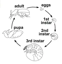 The eggs hatch after 1.5–2 weeks and under favourable conditions, the three larval stages are completed after 1.5–2 weeks (first instar), 2–3 weeks (second instar) and 13–17 weeks (third instar). This adds up to around 22 weeks or 5 months for the average duration of the egg and three larval stages under favourable conditions. However, the development of the larvae can be significantly delayed by unsuitable conditions like low temperatures or a sub optimal breeding substrate.[6][13]