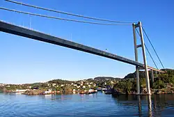 The Askøy Bridge (Norwegian: Askøybroen) is a suspension bridge that crosses the Byfjorden between the municipalities of Bergen and Askøy in Vestland county, Norway. It is 1,057 meters (3,468 ft) long and has a main span of 850 meters (2,789 ft). Its span was the longest for any suspension bridge in Norway, until the Hardanger Bridge, also in Vestland, opened in August 2013. Now the bridge is the third longest in Norway. It carries two lanes of County Road 562 and a combined pedestrian and bicycle path. The bridge's two concrete pylons are 152 meters (499 ft) tall and are located at Brøstadneset in Bergen municipality (on the Bergen Peninsula of the mainland) and Storeklubben in Askøy municipality (on the island of Askøy). The bridge has seven spans in total, although all but the main span are concrete viaducts. The bridge has a clearance below of 62 meters (203 ft).
